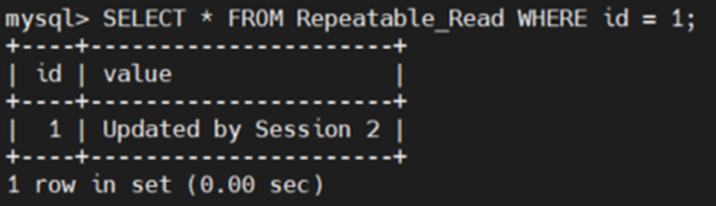 | -- 다른 세션에서 데이터 업데이트 시도 #Session2 -- 트랜잭션 시작 SET TRANSACTION ISOLATION LEVEL REPEATABLE READ; START TRANSACTION; -- 데이터 업데이트 후 커밋 UPDATE Repeatable_Read SET value = 'Updated by Session 2' WHERE id = 1; COMMIT; ![]() |