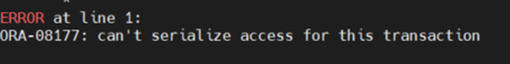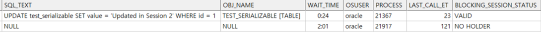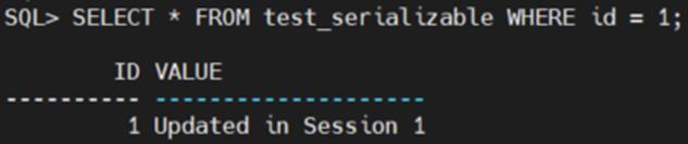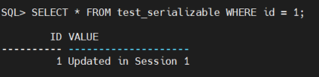 | SERIALIZABLE 테스트 SERIALIZABLE 격리 수준에서는 트랜잭션이 직렬적으로 실행되는 것처럼 보장되며, 다른 트랜잭션이 데이터를 동시에 조회 수정하거나 삽입하려고 하면 대기하거나 충돌이 발생합니다. session1 CREATE TABLE test_serializable ( id NUMBER PRIMARY KEY, value VARCHAR2(100) ); -- 초기 데이터 삽입 INSERT INTO test_serializable VALUES (1, 'Initial Value'); COMMIT; -- SERIALIZABLE 설정 SET TRANSACTION ISOLATION LEVEL SERIALIZABLE; -- 데이터 읽기 SELECT * FROM test_serializable WHERE id = 1; -- 데이터 업데이트 UPDATE test_serializable SET value = 'Updated in Session 1' WHERE id = 1; -- 트랜잭션을 보류하여 다른 세션에서 상태 확인 가능 COMMIT; -- 데이터 읽기 SELECT * FROM test_serializable WHERE id = 1; -- COMMIT 하지 않고 대기 |