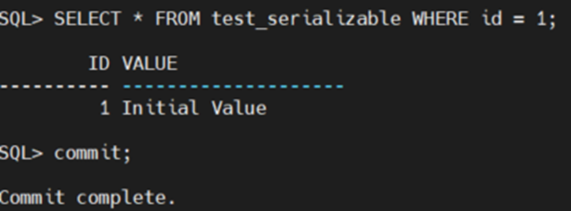 | READ COMMITTED 테스트 -- 테이블 생성 CREATE TABLE READ_COMMITTED ( id NUMBER PRIMARY KEY, value VARCHAR2(100) ); -- 데이터 삽입 INSERT INTO READ_COMMITTED VALUES (1, 'Initial Value'); COMMIT; |