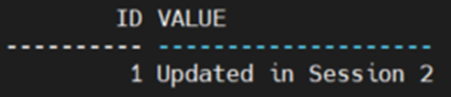 | 세션1 COMMIT하면 세션 2의 UPDATE 작업이 진행됩니다. 이후 세션 2에서 데이터를 다시 읽으면 최신 값을 확인할 수 있습니다. #Session2 ![]() ![]() 아직 Session 2에서 commit 하지 않았기 때문에 현재 Session1에서는 Updated in Session 1 표시되며 LOCK 대기 상태는 풀리게 됩니다. |
