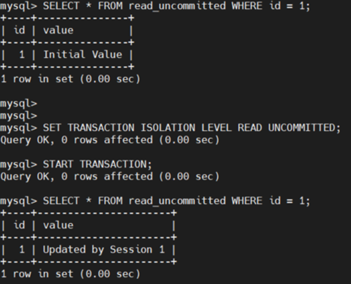 | #Session2 SET TRANSACTION ISOLATION LEVEL READ UNCOMMITTED; START TRANSACTION; -- Session 1에서 업데이트된 값 읽기 (Dirty Read 가능 여부 확인) SELECT * FROM read_uncommitted WHERE id = 1; -- 트랜잭션 종료 COMMIT; ![]() Session 2에서 Session 1의 미완료 (Commit하지 않은) 데이터를 읽을 수 있음(Dirty Read). |