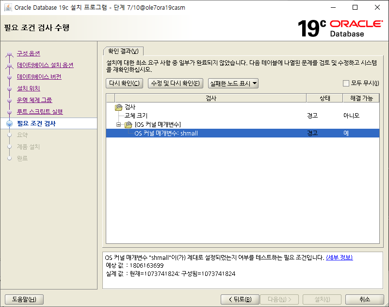 구성 환경 VMWARE VIRTUALBOX 6.1.22 OS Oracle Linux 7.5 HostName ole7ora19casm DB 19.3.0.0 SID ORCL LISTENER 1521 FILESYSTEM ASM Oracle Pre Installation #cat /etec/redhat-release [root@ole7ora19casm..