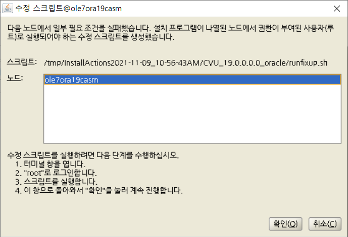 ![]() ![]() [root@ole7ora19casm ~]# /tmp/InstallActions2021-11-09_10-56-43AM/CVU_19.0.0.0.0_oracle/runfixup.sh All Fix-up operations were completed successfully. |