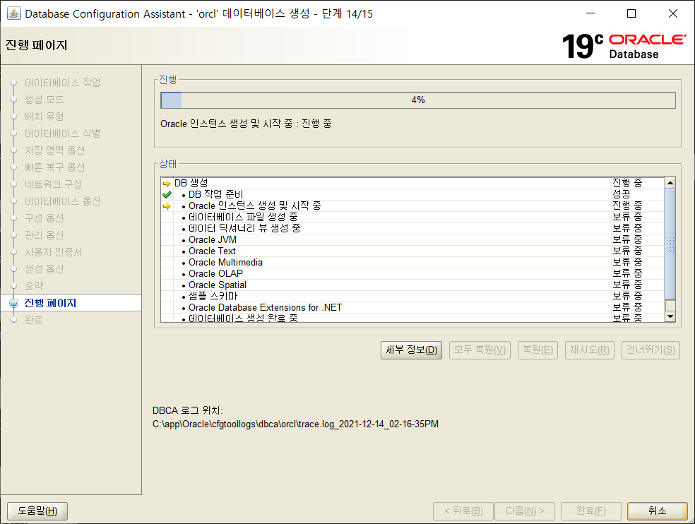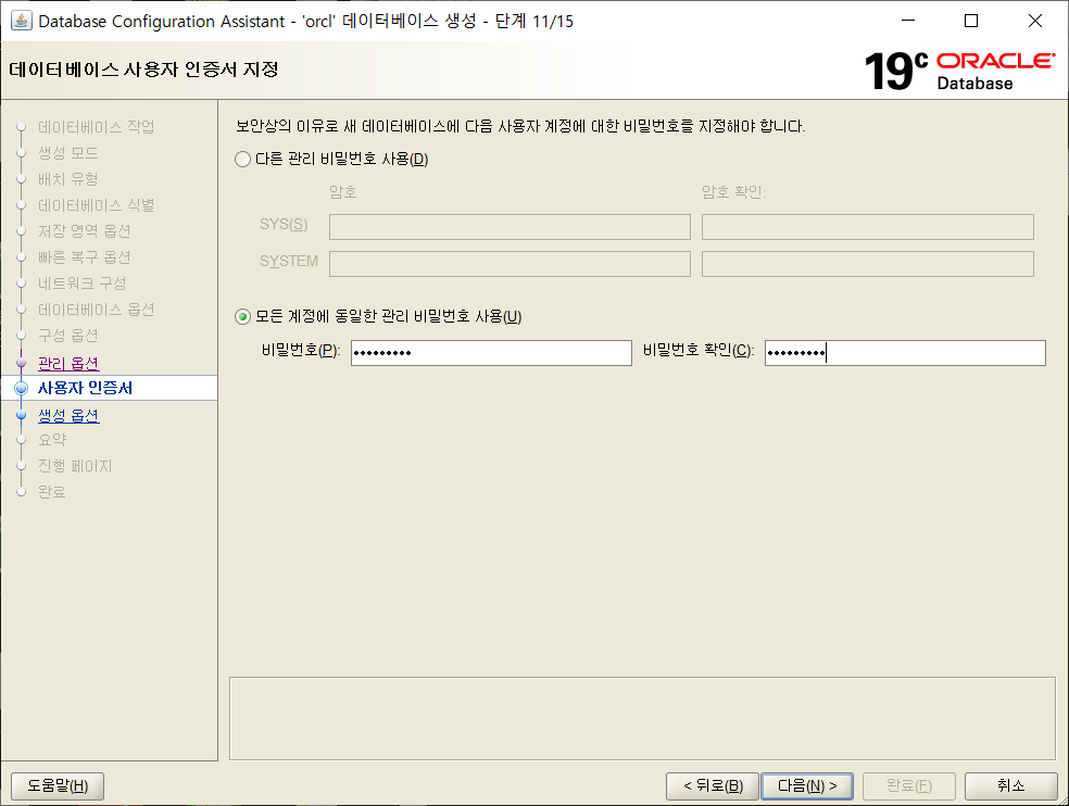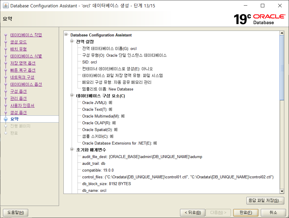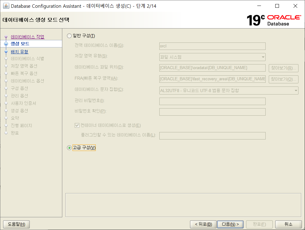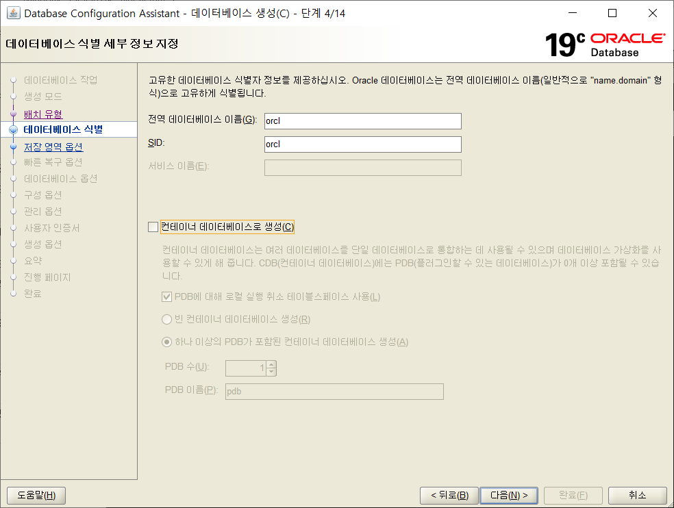 ![]() 전역 데이터베이스 이름 : orcl SID : orcl 컨테이너 데이터베이스 생성 : 사용안함 |