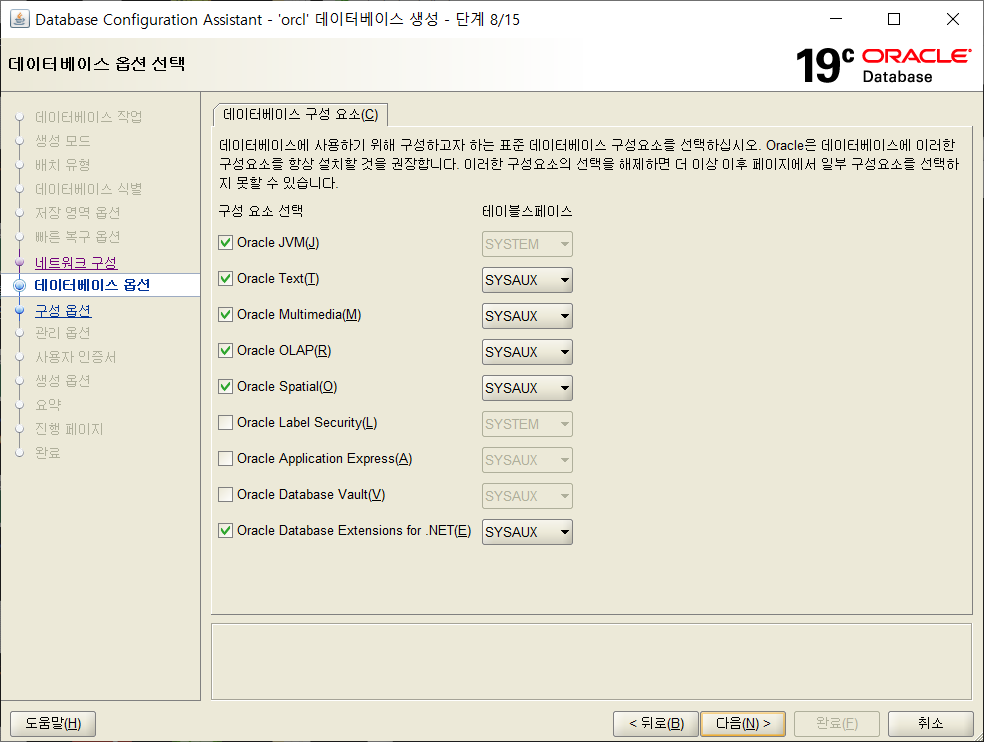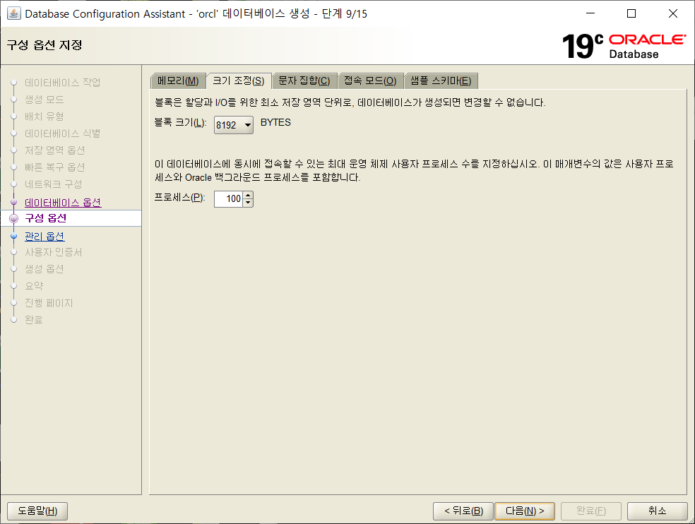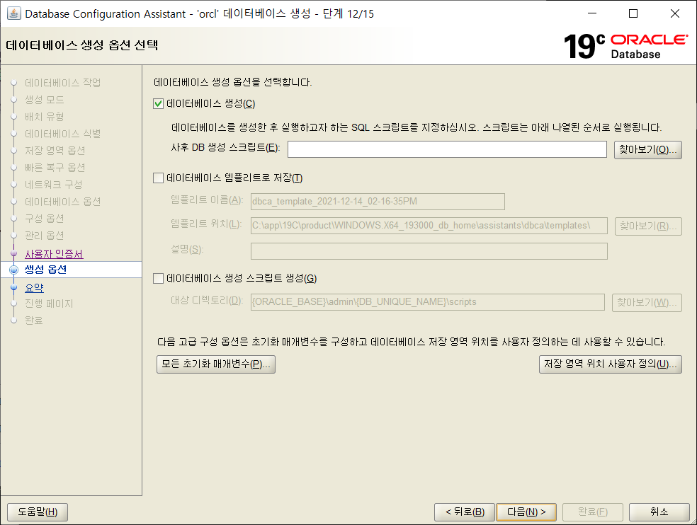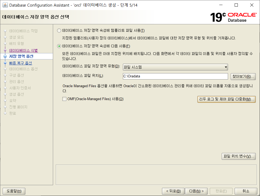 ![]() 데이터베이스 저장 영역 송성에 다음 사용 데이터베이스 파일 저장유형 : 파일시스템 데이터베이스 파일 위치 : C:\Oradata OMF : 사용안함 |