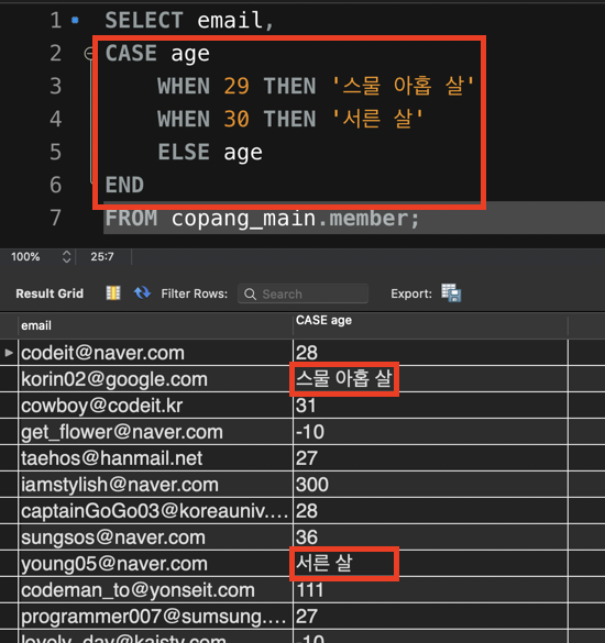 그리고 CASE 함수 중에서 ELSE age는 나머지 경우에는 모두 age 컬럼에 있던 값을 그대로 보여달라는 뜻입니다.