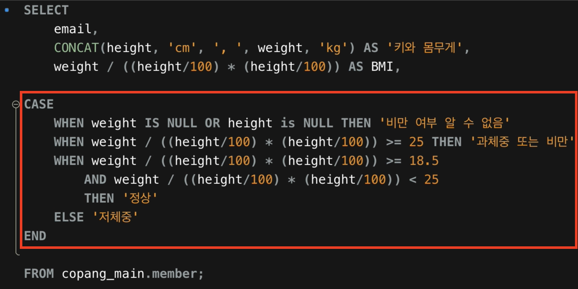 그럼 검색 CASE 함수는 단순 CASE 함수와 어떤 점이 다를까요? 일반적으로 단순 CASE 함수에서는 등호 연산(=) 밖에 할 수 없다는 단점이 있습니다. 하지만 검색 CASE 함수에서는 사용자가 직접 원하는 대로 조건을 설정할 수 있기 때문에 좀더 다양한 형태의 조건을 걸 수 있다는 장점이 있구요. 위 사진을 보면 BMI 값의 범위를 확인하는 조건들을 사용한 것을 볼 수 있는데요. 이건 등호 연산만 할 수 있는 단순 CASE 함수에서는 불가능한 일입니다.